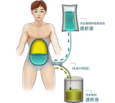 腹膜透析[2] (Peritoneal Dislysis,PD)是利用腹膜的半透膜特性,向腹腔內規律、定時注入透析液,膜一側毛細血管內血漿和另一腹腔內透析液借助溶質濃度梯度和滲透梯度,通過彌撒、對流和超榕的原理。以清除體內潴留的代謝廢物和過多的水分,糾正酸中毒和電解質紊亂,同時通過透析液補充所必需的物質。